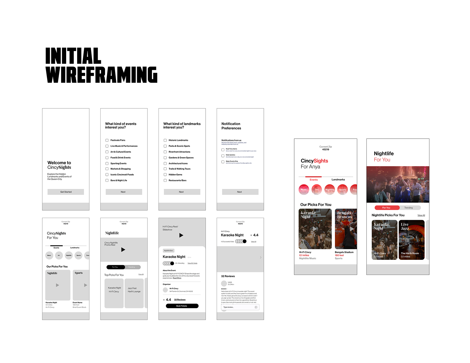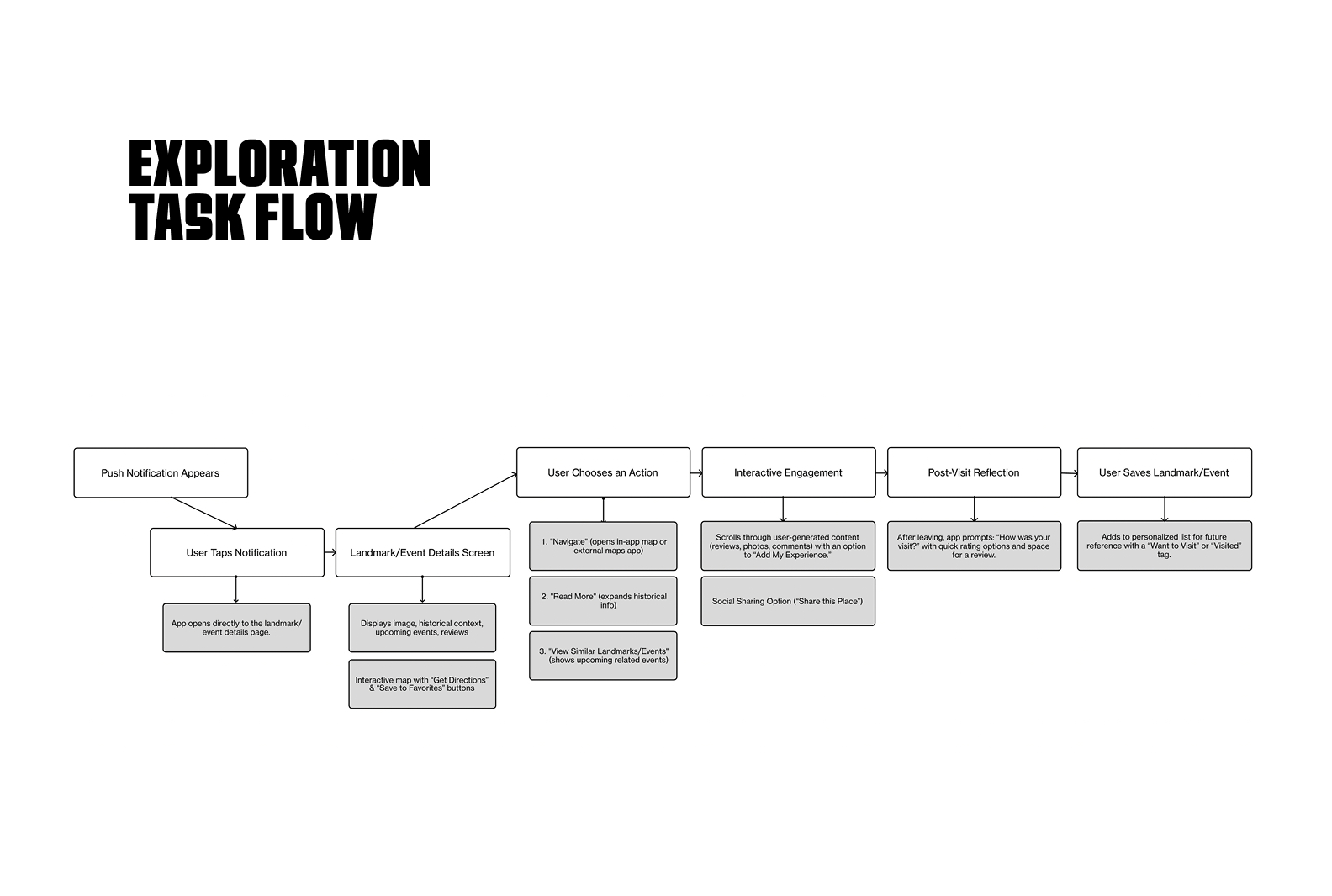 The app's purpose has always been to inspire spontaneous exploration, which made an exploration task flow essential from the start. Initially, I wasn't certain whether onboarding was necessary, but user insights revealed that an onboarding flow designed as a "teaser trailer" of Cincinnati added intrigue and helped spark curiosity for new users.